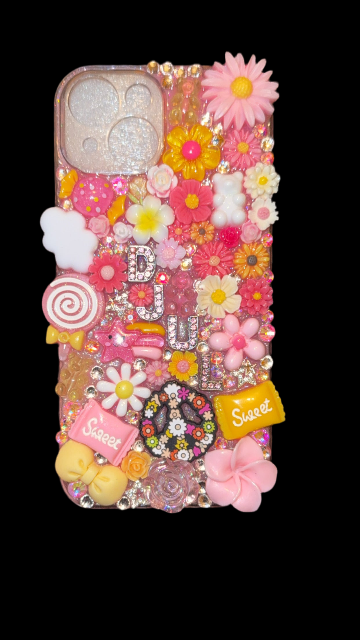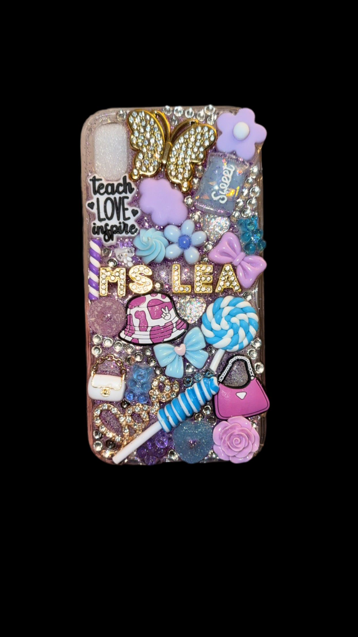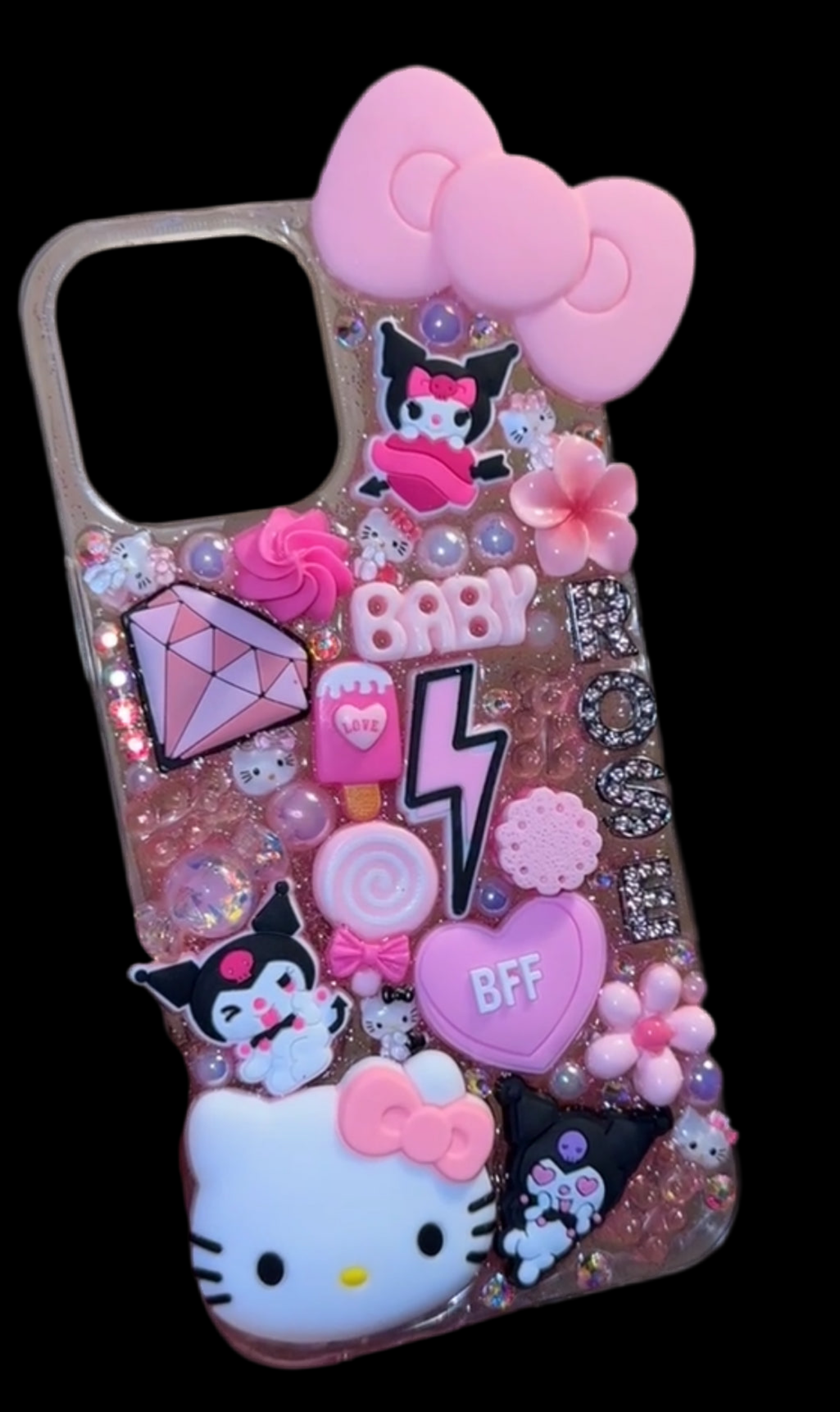 Random handpicked charms to match color or theme (i.e. Hello Kitty, Candy, Girly etc.) of your choice with name/word added. (up to 8 letters)